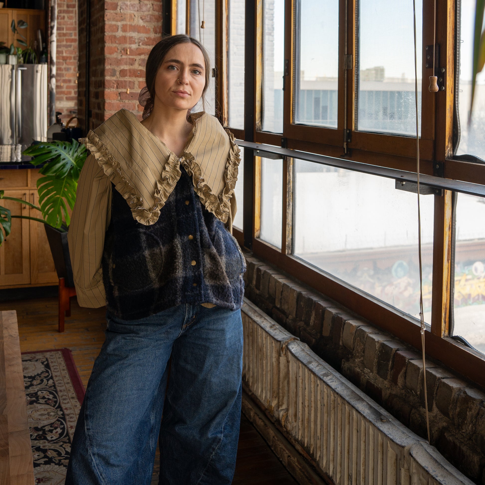 Dual-entry pockets, cropped length, wide-set sleeve. Cut and sewn from salvaged textiles in Crown Heights.