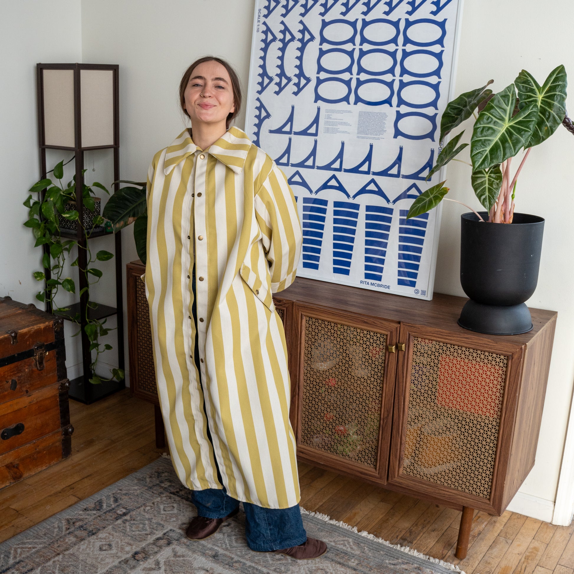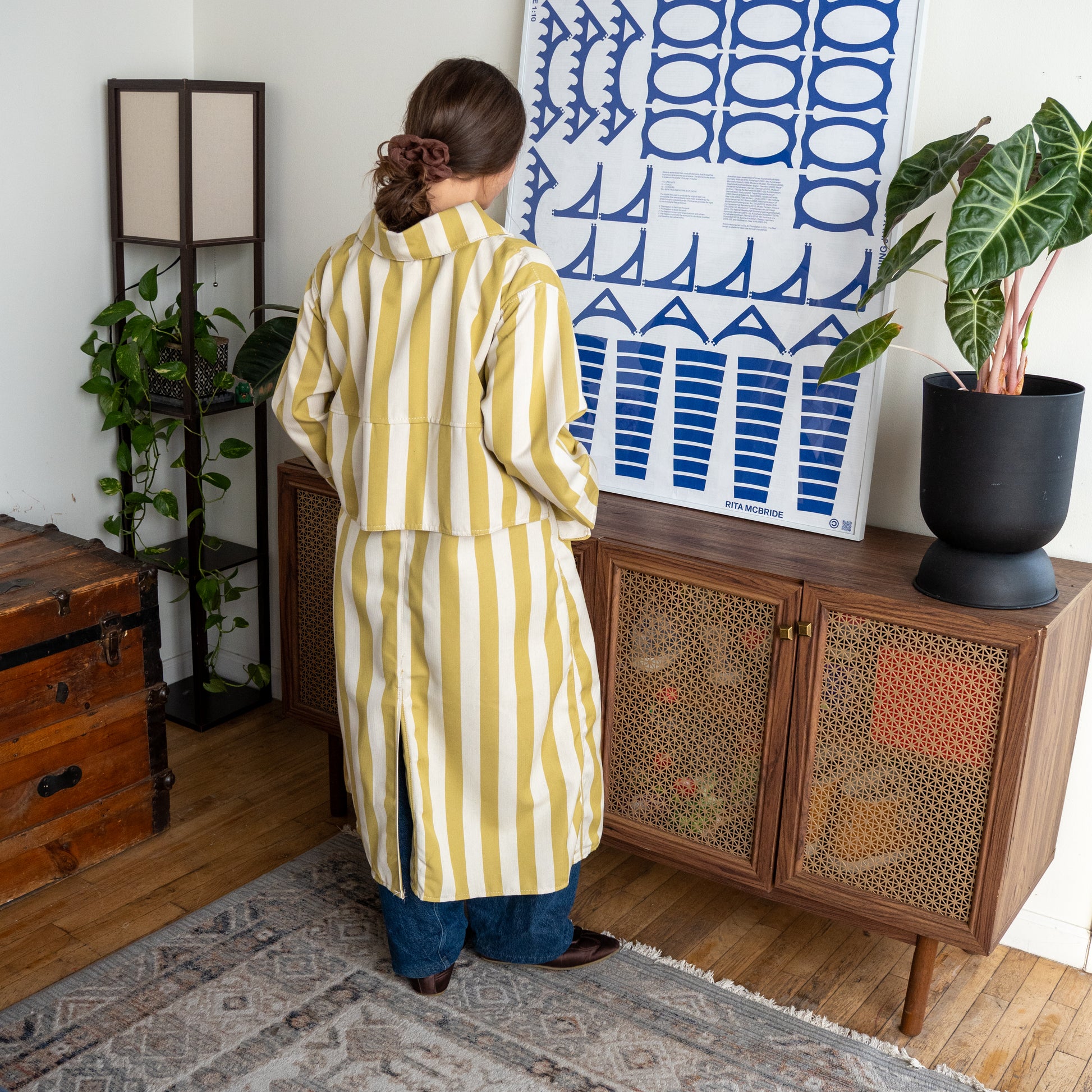 Welt pockets, snap-front closure, and caped back design detail, and lower back vent for movement. Cut and sewn from salvaged textiles in Crown Heights.