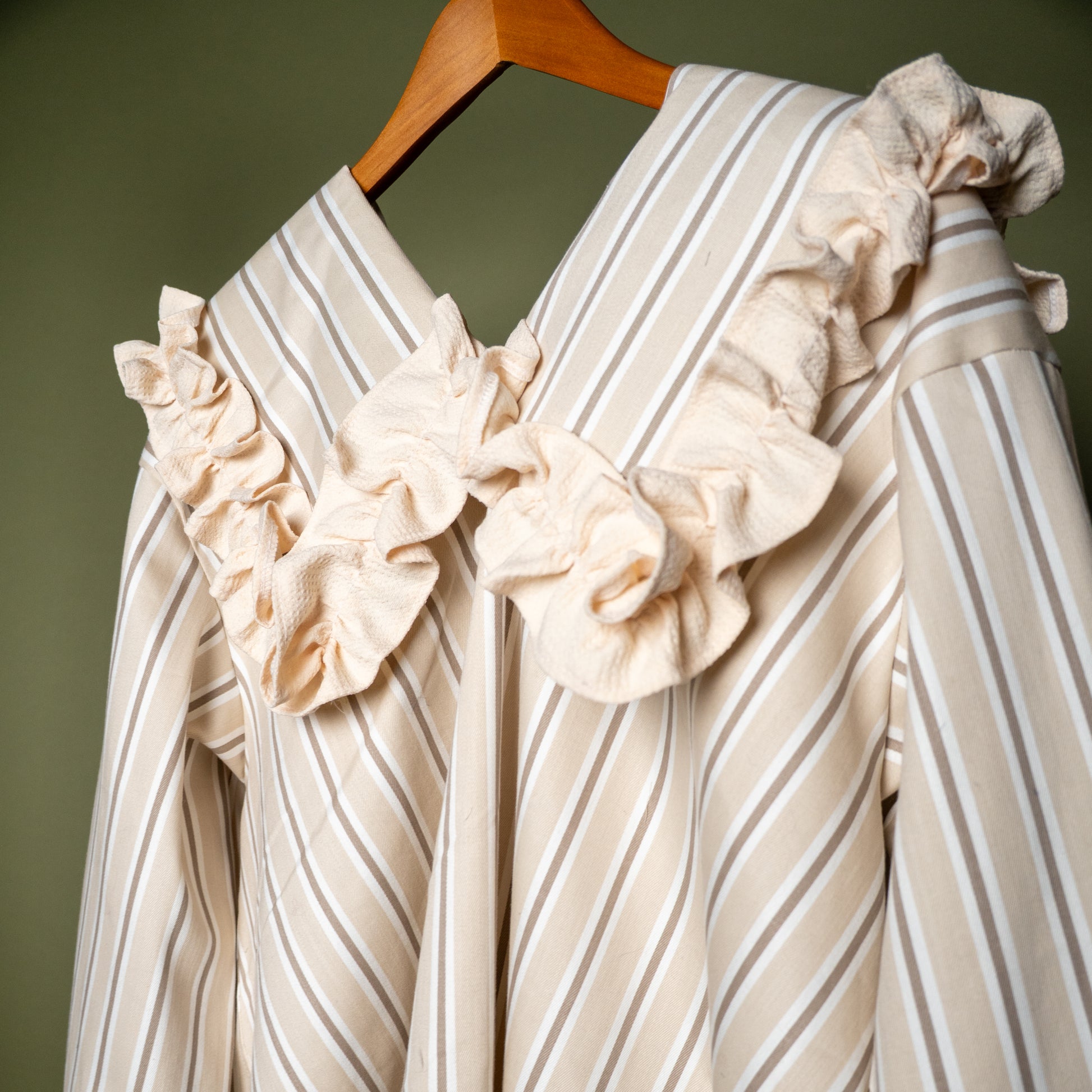 Versatile tunic with sculptural collar, large patch pockets, and rivets. Cut and sewn from salvaged textiles in Crown Heights. Details on this particular custom fabric: 100% Cotton + Elastic.