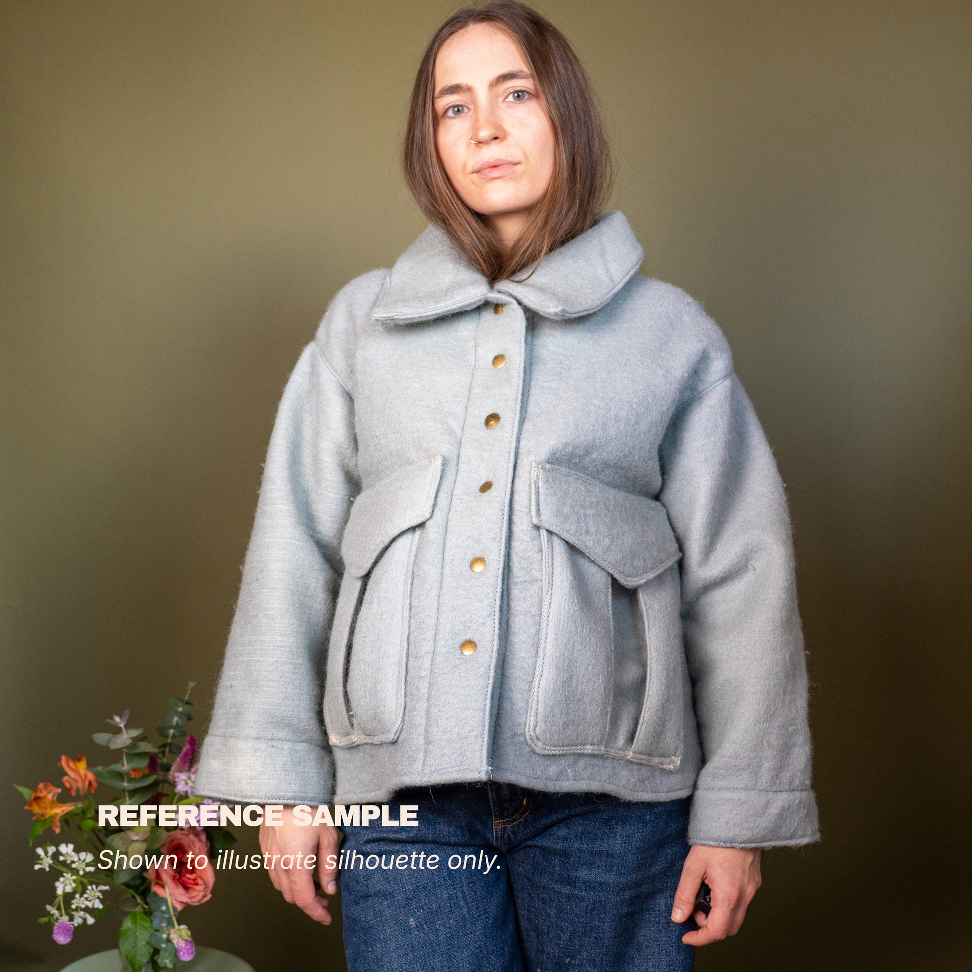 Dual-entry pockets, cropped length, wide-set sleeve. Cut and sewn from salvaged textiles in Crown Heights. Details on this particular custom fabric: 100% lightweight cotton.