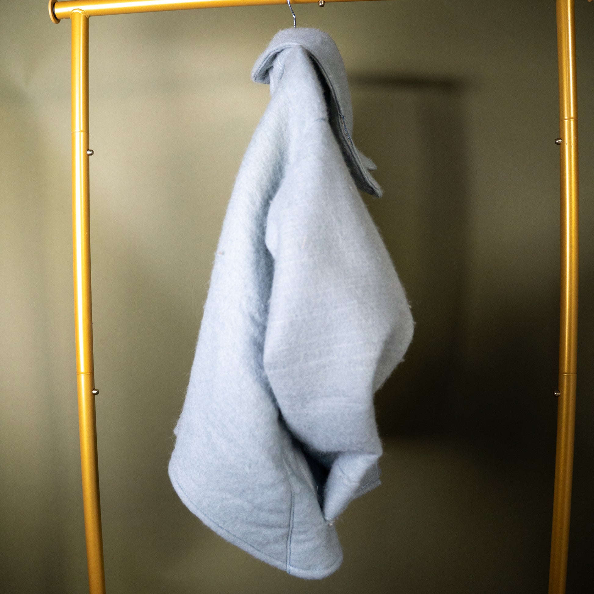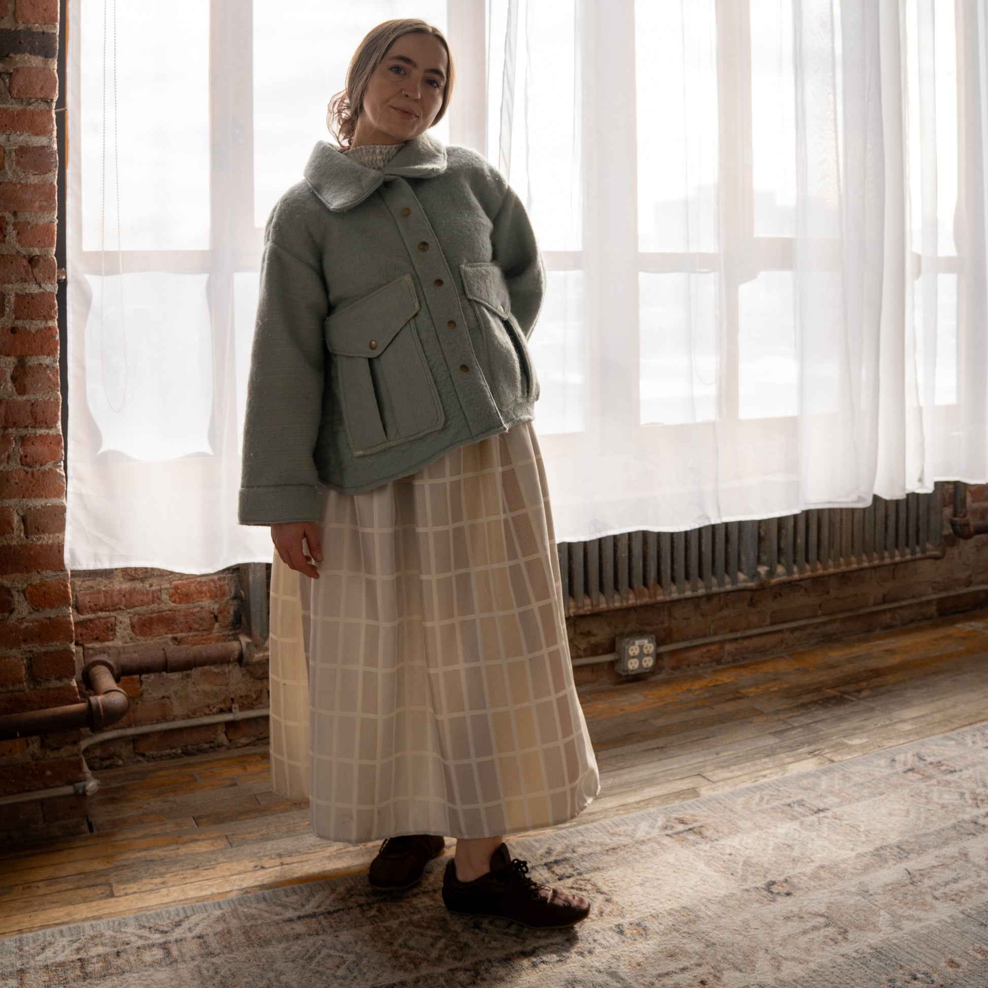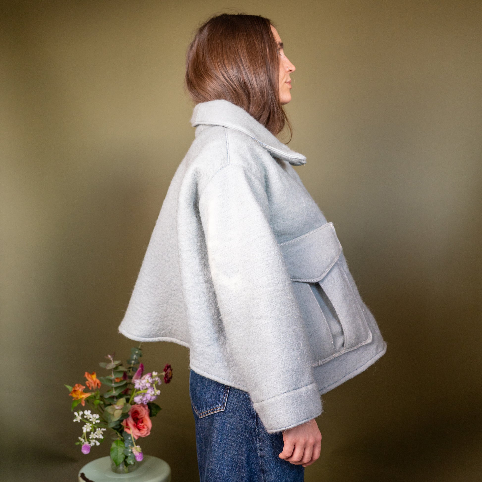 Dual-entry pockets, cropped length, wide-set sleeve. Cut and sewn from salvaged textiles in Crown Heights.
