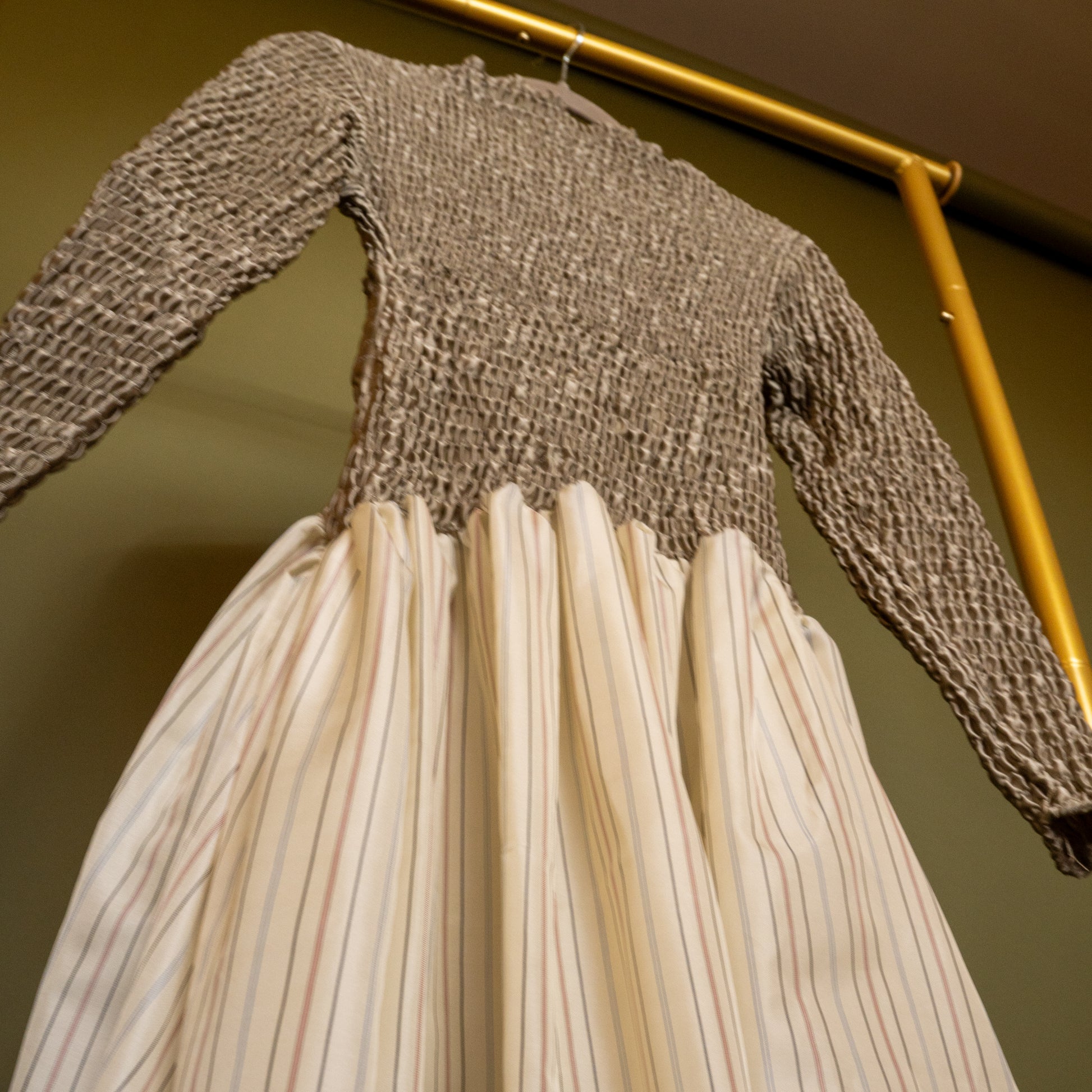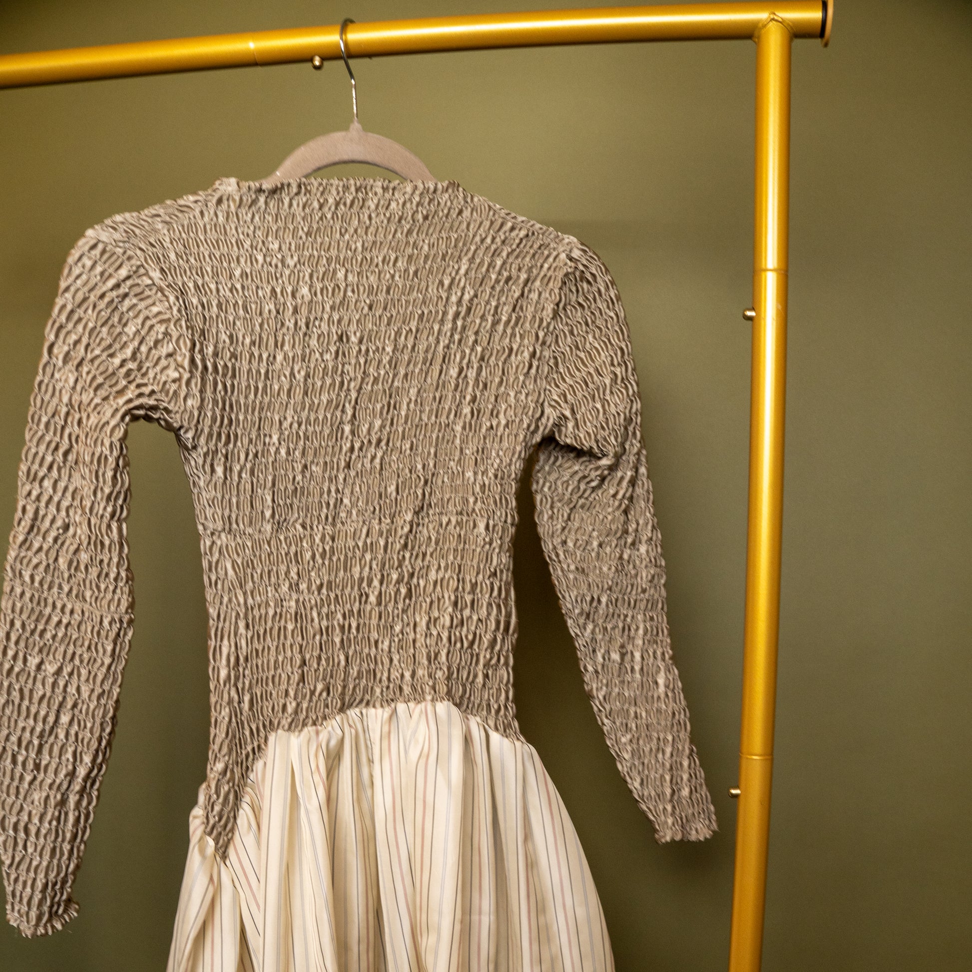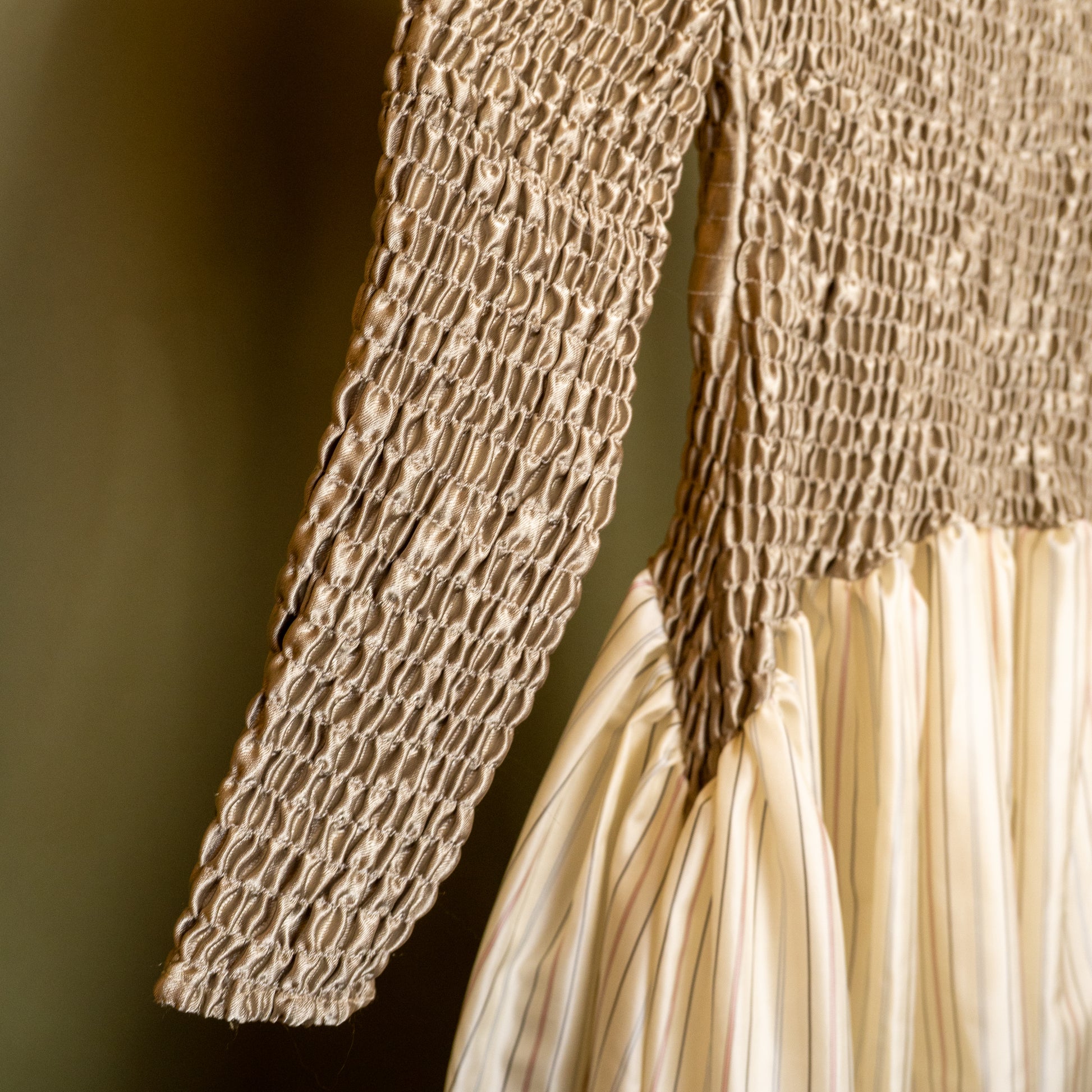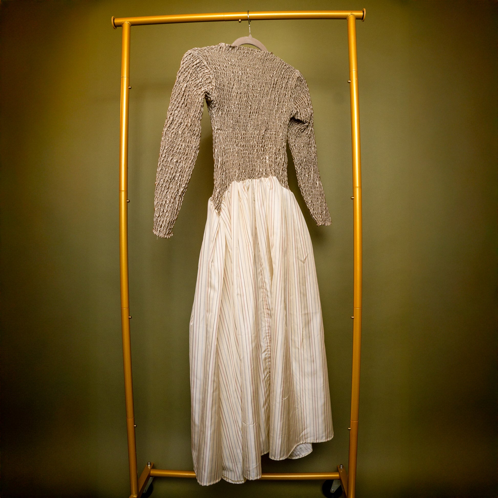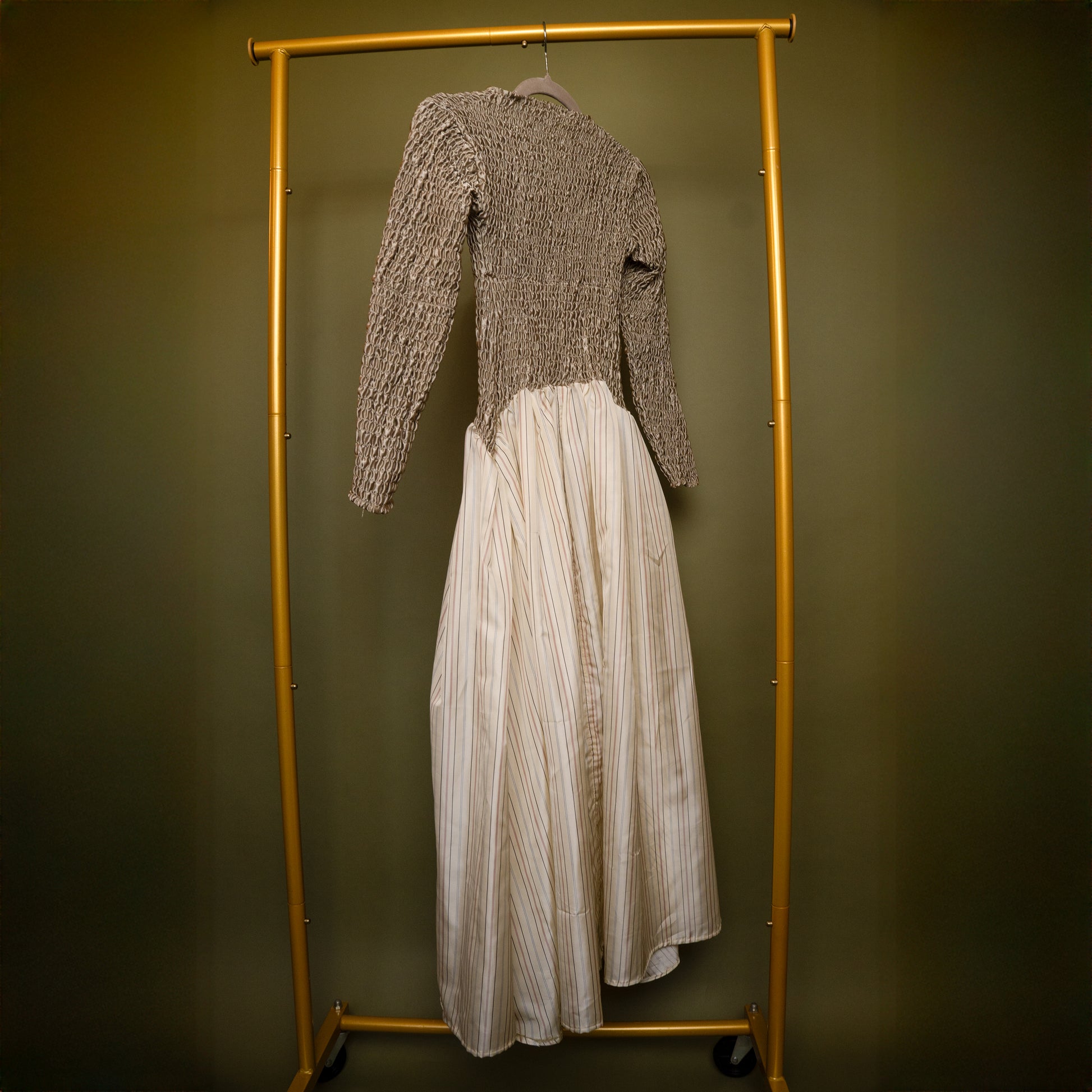 Hand-smocked midi with mock neck and dropped waist. Cut and sewn from salvaged textiles in Crown Heights. Details on this particular custom fabric: 100% Engineered Fibers.