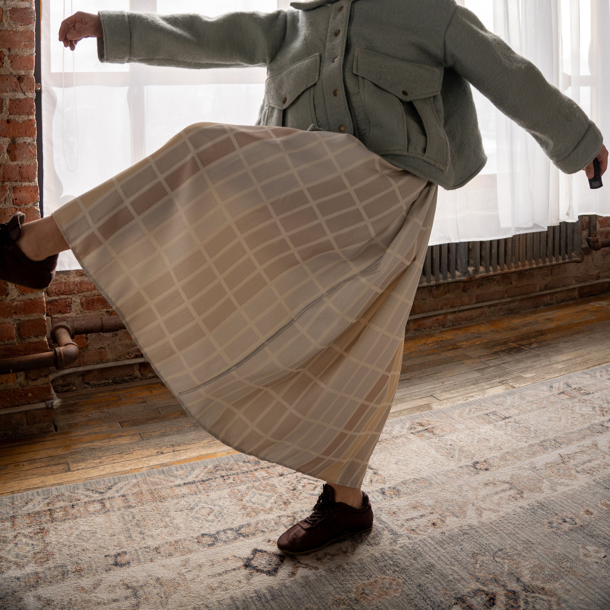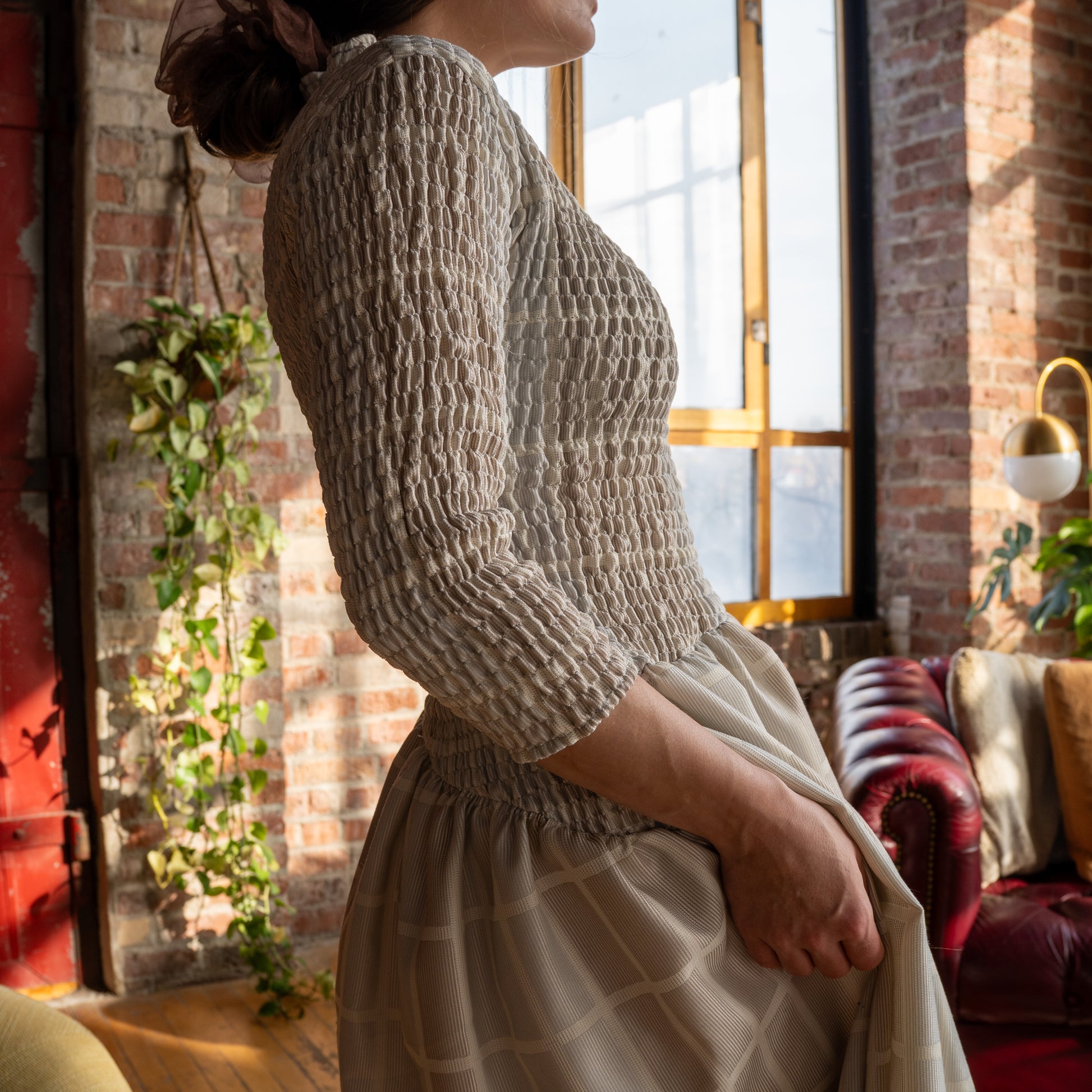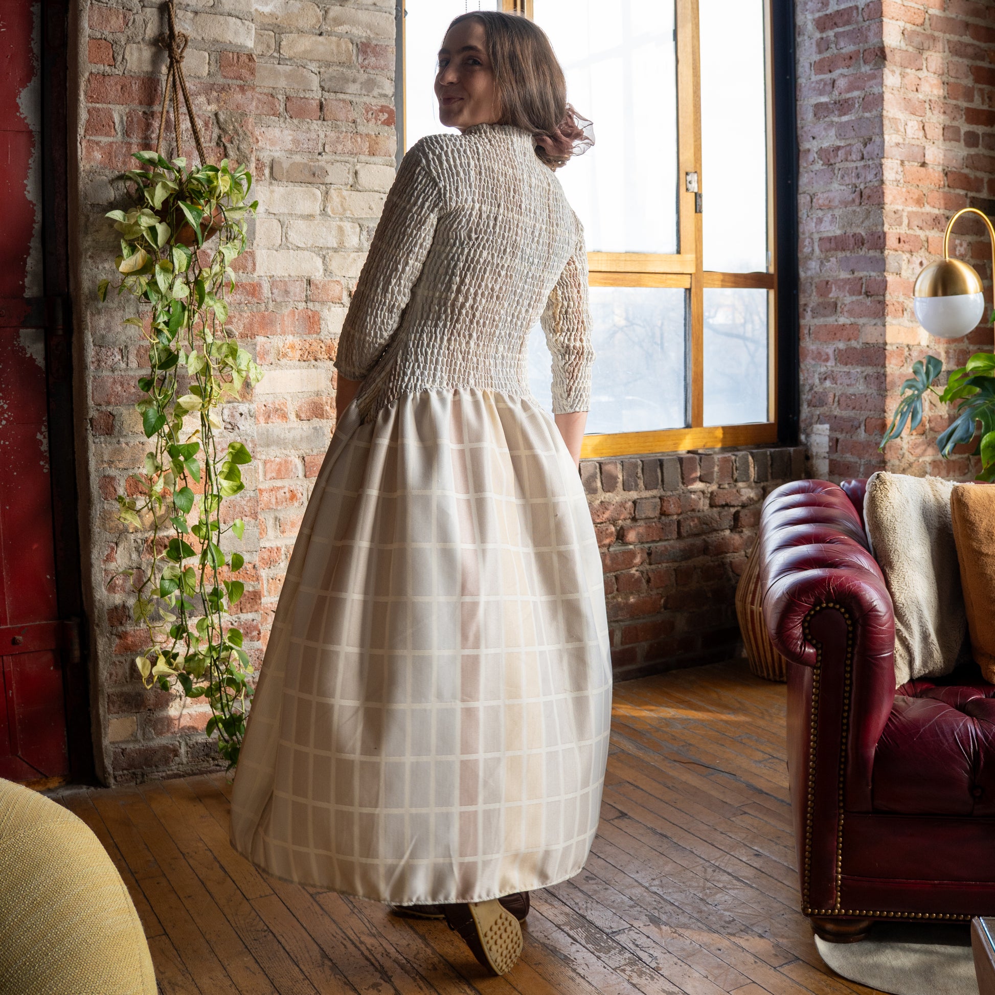 Hand-smocked midi with mock neck and dropped waist. Cut and sewn from salvaged textiles in Crown Heights. Details on this particular custom fabric: 100% engineered fibers
